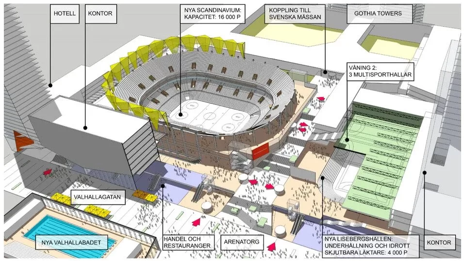 Exakt hur den nya arenan ska se ut är inte bestämt. Klart är dock att politikerna önskar en kapacitet på 16000 vid sportevenemang, vilket i sin tur skulle göra det till Skandinaviens största inomhushall. De önskar även riva det gamla Valhallabadet och ersätta det med ett nytt centralbad på andra sidan Valhallagatan. Kostnaden för det sistnämnda projektet väntas bara det landa på upp till en miljard kronor.